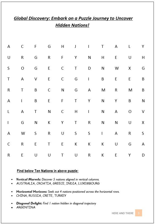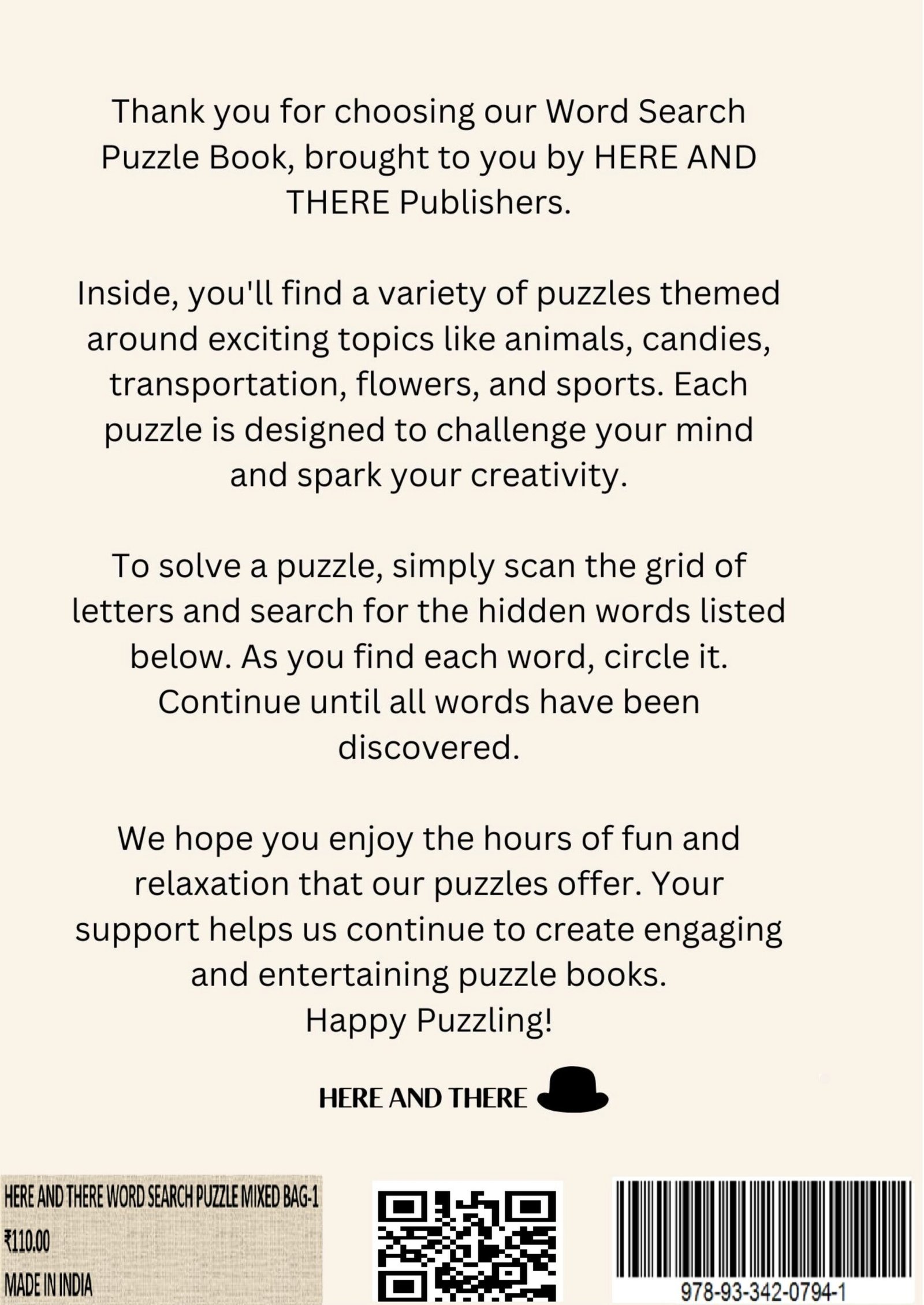 HERE AND THERE’s WORD SEARCH BOOK – MIXED BAG 1 is a thoughtfully designed puzzle book created for users who enjoy variety, clarity, and quality. This engaging collection brings together 50 diverse word search topics, including animals, candies, transportation, flowers, sports, nations, sports activities, mountain peaks, foods, occupations, nature, weather, cities, fruits, vehicles, hobbies, festivals, landmarks, and many more. Each puzzle offers a fresh theme, making the book perfect for sustained interest and mental stimulation.